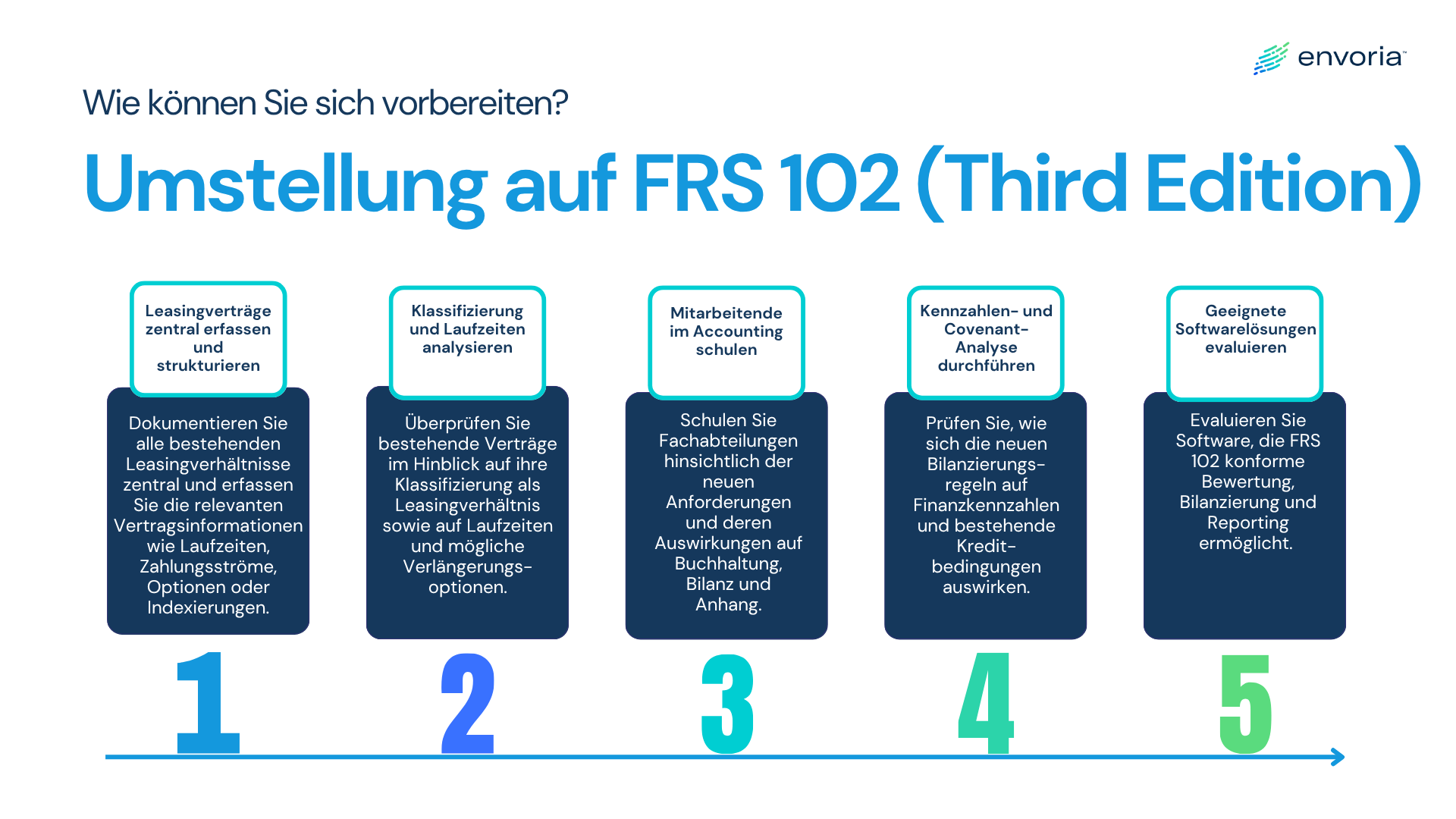 Insbesondere für Unternehmen, die viele oder komplexe Leasingverhältnisse haben, erfordert die Umstellung auf FRS 102 (Third Edition) eine sorgfältige Vorbereitung. Um die Kommunikation mit Banken, Investoren und anderen Stakeholdern reibungslos zu gestalten und finanzielle Überraschungen zu vermeiden, lohnt es sich, Anforderungen frühzeitig zu kennen und Maßnahmen für eine strukturierte Umstellung einzuleiten wie z.B.: