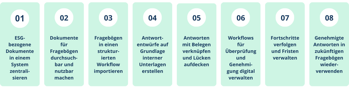 Der oben beschriebene achtstufige Arbeitsablauf veranschaulicht, wie ESG-Fragebögen auf strukturierte und wiederholbare Weise bearbeitet werden können, von der Zentralisierung von Dokumenten bis zur Wiederverwendung genehmigter Antworten im Laufe der Zeit. In der Praxis wird die manuelle Verwaltung dieses Prozesses jedoch mit zunehmendem Umfang und Komplexität der ESG-Anfragen immer schwieriger.
